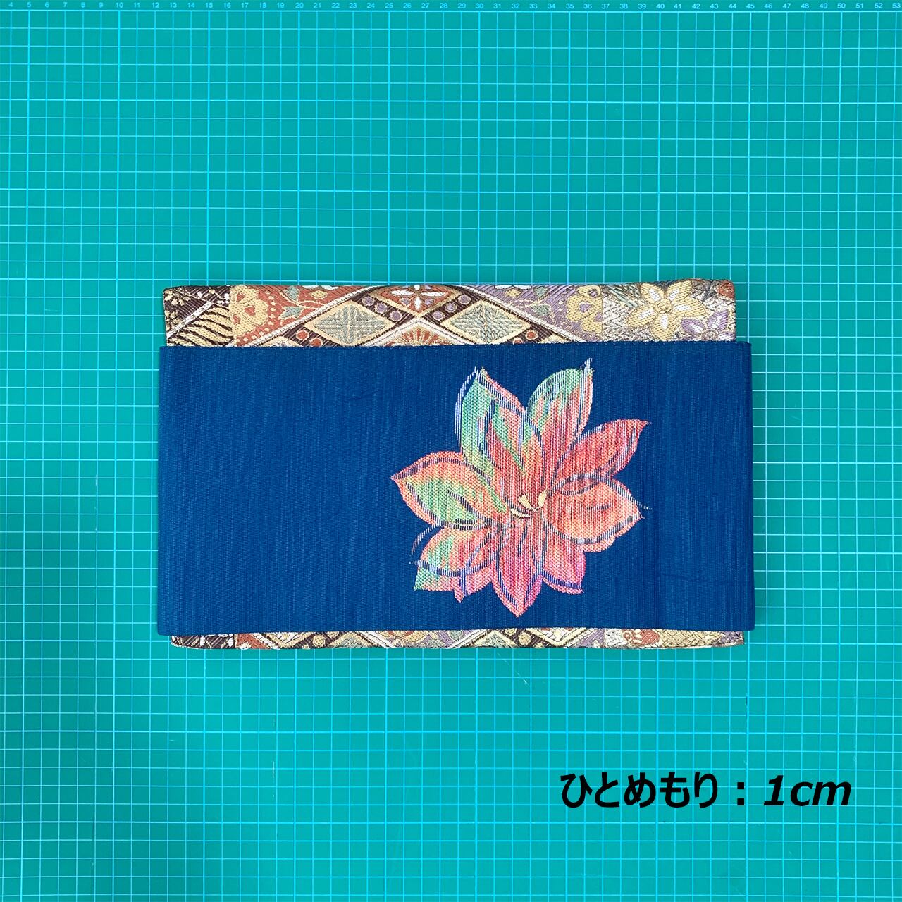 半幅の帯をフラップ留め・中の仕切りとして使用しています。