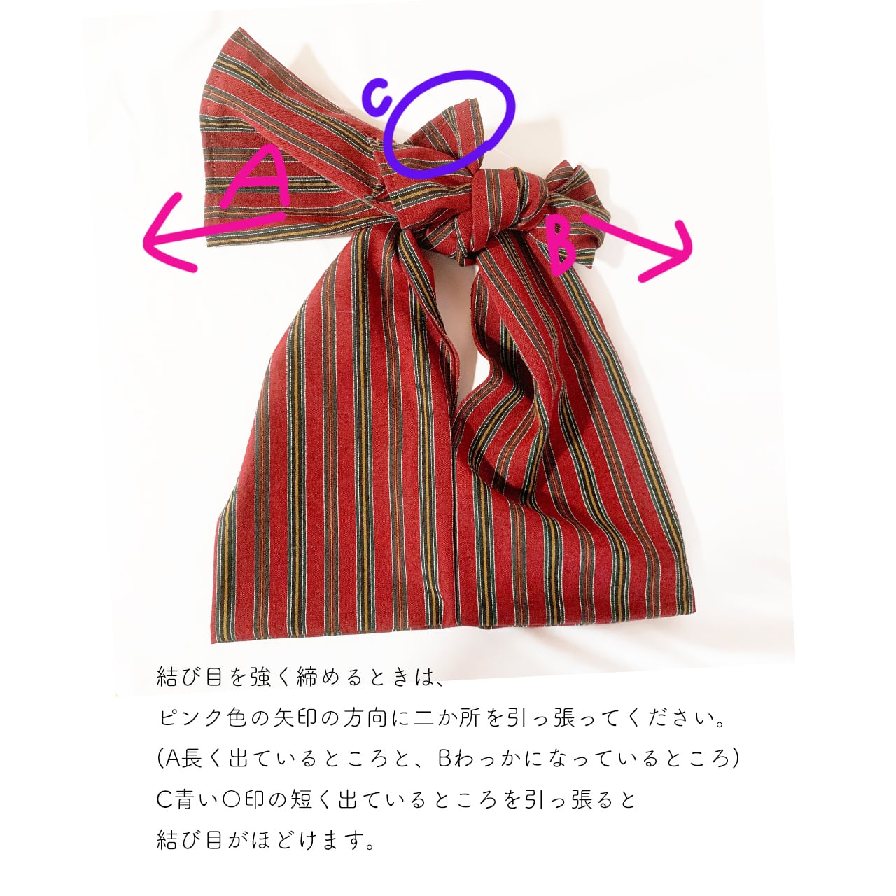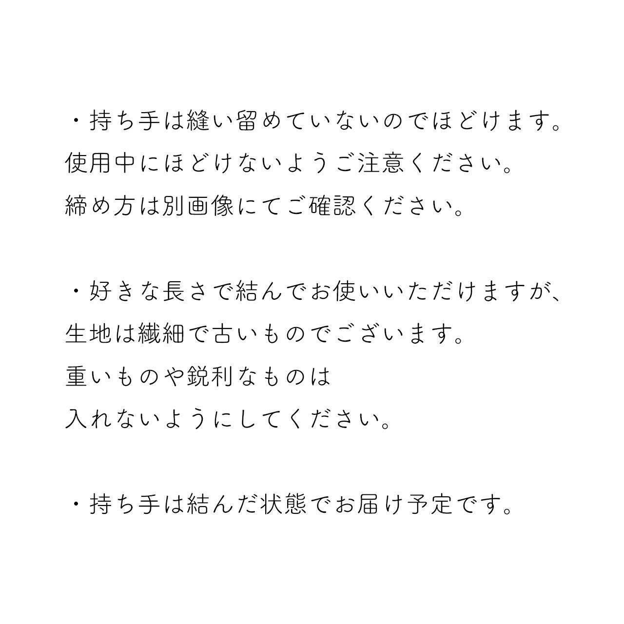 ※持ち手のりぼんは縫い留めていないのでほどけます。使用中に緩まないようご注意ください。締め方は画像にてご確認ください。